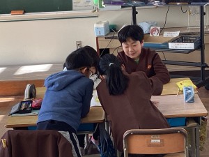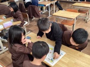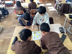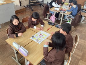 今日の3時間目にすごろくをしました。止まったマスに書いてあるお題について話をしたり、グループのみんなで声をそろえて「あけましておめでとう!」とあいさつをしたりするなど、笑顔あふれる活動となりました。和やかで温かい新年のスタートとなりました。