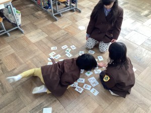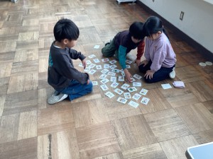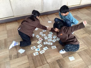 3グループに分かれて、ことわざかるたにチャレンジしました。読み札の言葉をよく聞いて、真剣に絵札を探すことができました。