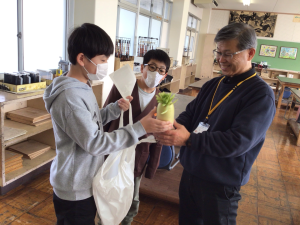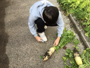 種から育てた大根が大きく育ちました。大切に育てた大根をきれいに洗って先生に届けました。