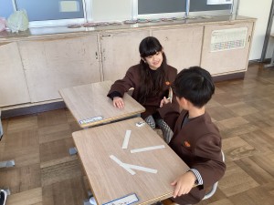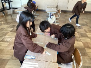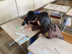 国語科「これは、なんでしょう」の学習で、教室にあるものの3ヒントクイズを作っています。友だちと一緒に、色・形・どんな時に使うかなどのヒントをたくさん集めました。答えにするものの近くまで行ってどんなヒントがあるか考えたり、友だちと顔を見合わせてじっくりヒントを考えたりして楽しそうに話し合い活動する姿が見られました。また、「あー!それもあるね!」「ほんまや!いいやん!」などと相槌を打ちながら友だちと相談する様子も見られ、友だちの考えを受け入れながら考えを深める子どもたちの姿に成長を感じています。
