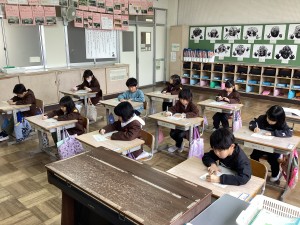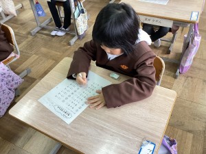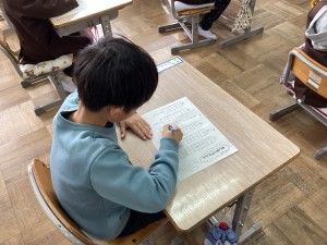 毎週木曜日の北郷里タイムでは、カタカナや漢字の復習とくり上がり・くり下がりの計算練習の「もくもくプリント」に取り組んでいます。一人ひとりが自分のペースで黙々と問題を解く時間として大切にしています。繰り返し書いて練習することで知識が定着することを期待しています。
